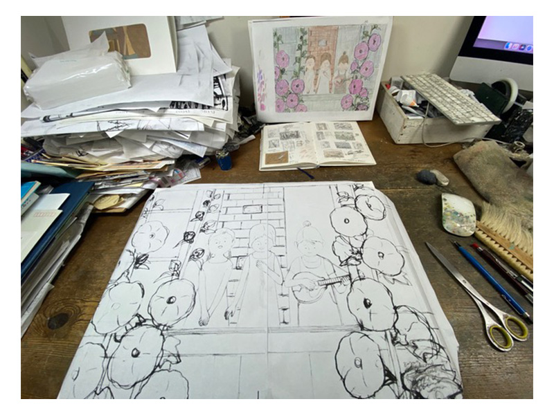 スケッチしています。絵はそのスケッチを元に生まれます。皆さんやってる事と