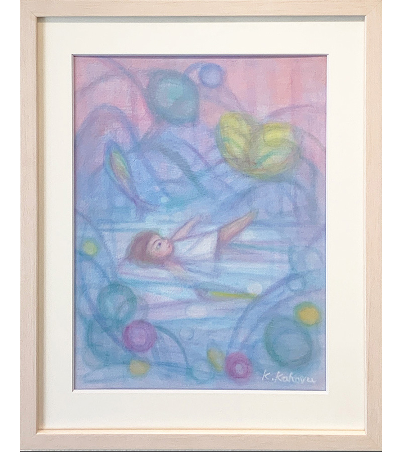 A:今回の個展の絵は、偶然母の49日から描き出しました。花瓶にさしたピンクの芍薬の上でピョンピョン跳ねている女の子になった母を感じて最初の絵になりました。目の前で突然あちらの世界に飛びたってしまったショックは大きく、どこかに空間移動したような強い感覚をもってしまい、自分も少し世界が移動したようななかにいました。